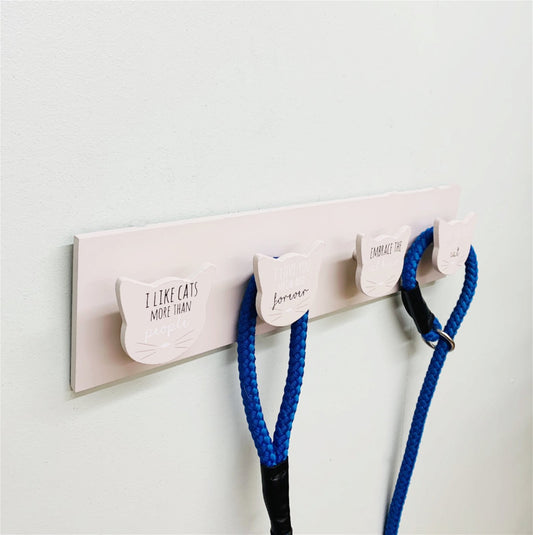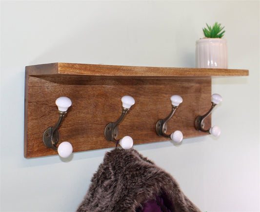 Set of 4 White Ceramic Double Coat Hooks On Wooden Base With Shelf