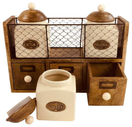 Sold outWooden Cabinet With 3 Jars & Drawers