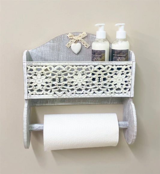 Grey Wooden Kitchen Towel Holder With Cutout Pattern Shelf